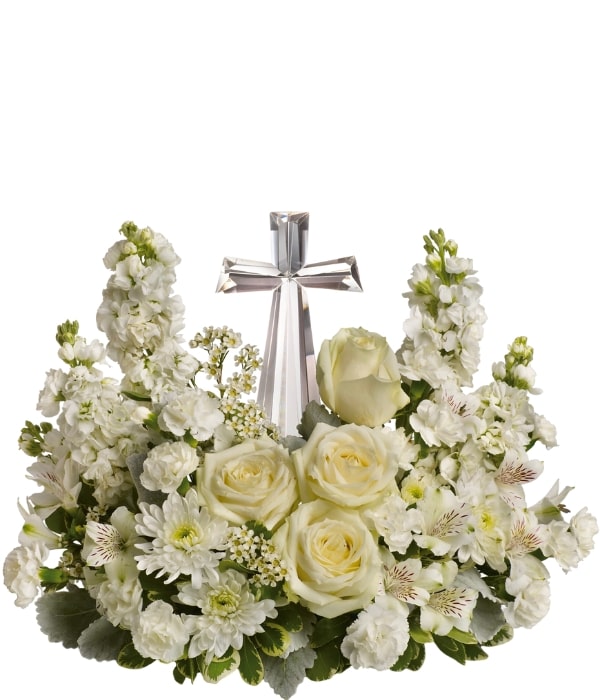 An exquisite crystal cross is surrounded by a bed of lovely blossoms. It is sure to be appreciated and always remembered. Includes premium white roses, white alstroemeria, white stock, white mini carnations, white cushions, white baby’s breath and variegated pittosporum.